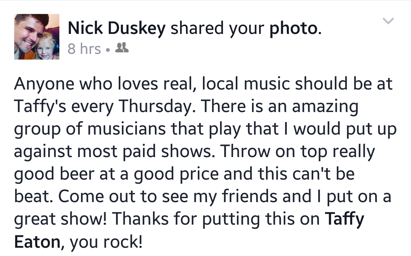 Taffy’s is known to provide a stage for new performers who go on to play their own gigs, record CD, etc . . . . but then we’re also known for providing a stage to lots of talented folks who never become famous, but who keep the arts alive and growing for all to enjoy.